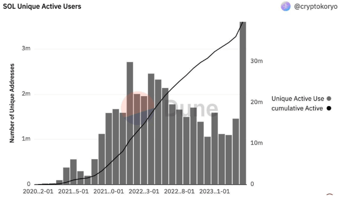 Several factors take credit for the value surge in SOL, with one key factor being the stunning grown in the number of active users in the Solana network. Data by Dune Analytics indicates that the number of active SOL users soared to around 3.5 million on May 1, a remarkable 146% rise from April 1, bringing the cumulative number of unique active users on the Solana network to an all-time high of 39.75 million.