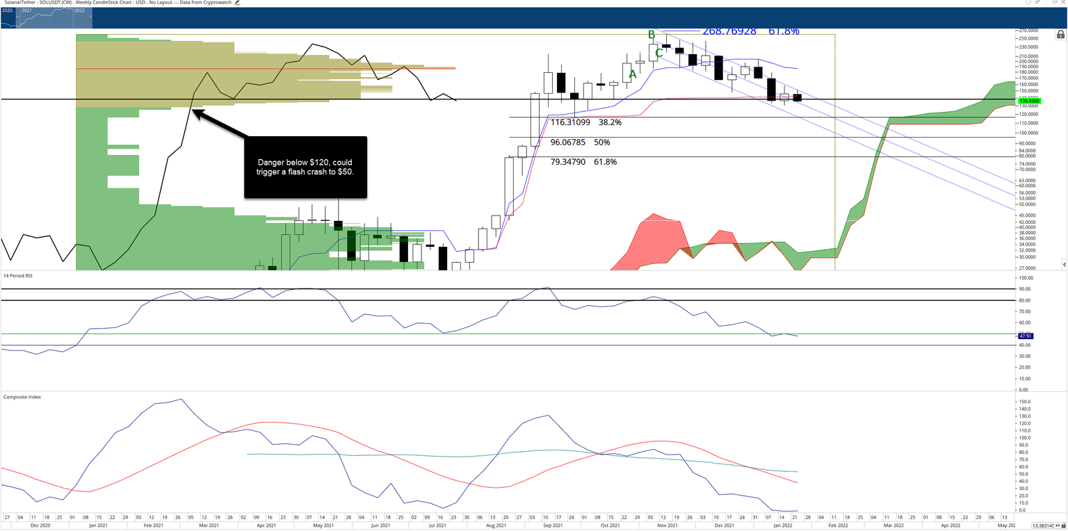It can not be overstated how vital it is to maintain the $120 value area for Solana. The volume profile between $120 and $50 is extremely thin to non-existent in some areas. Fragile areas in the volume profile act as a vacuum – when price action moves away from a high volume node and into a thing volume node, price gets ‘sucked’ through to the next high volume node.