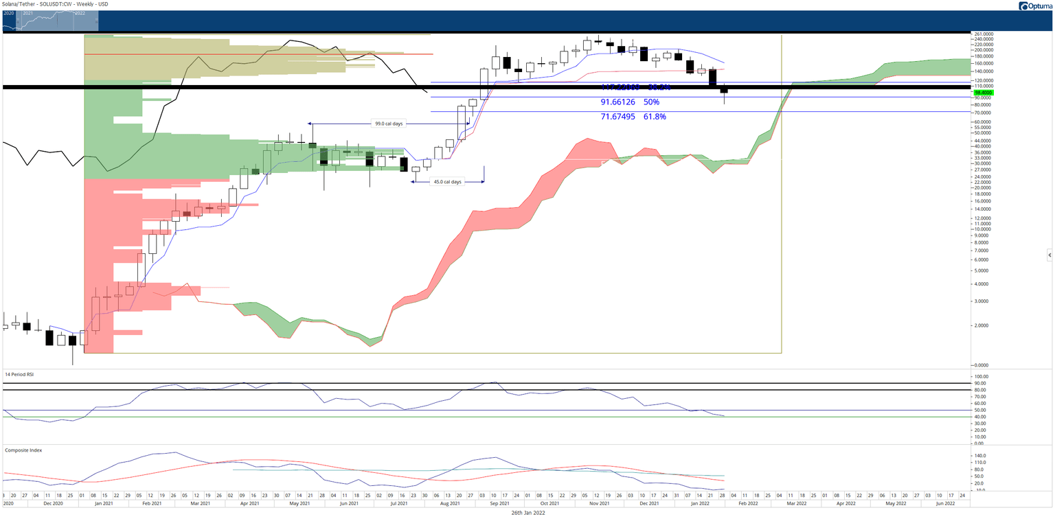 Before any sustained rally can be triggered and maintained, however, a series of resistance levels will be tested. The first is at the $110 value area, which contains a cluster of prior Fibonacci confluence zones (thick black line) and a high volume node in the Volume Profile. If bulls can push Solana price and hold it above $110, then the road to retest $150 becomes more manageable.