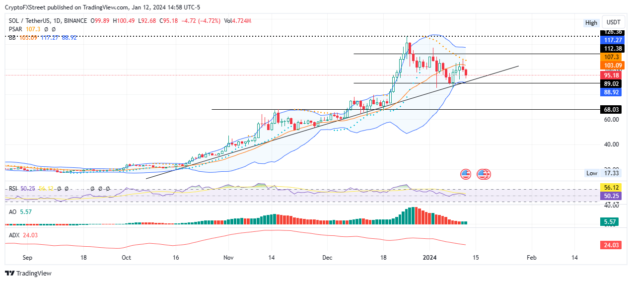 If the support offered by the confluence between the ascending trendline, the lower band of the Bollinger indicator, and the horizontal line around $89.02, the bulls could still recover in a bold attempt to salvage Solana price.
