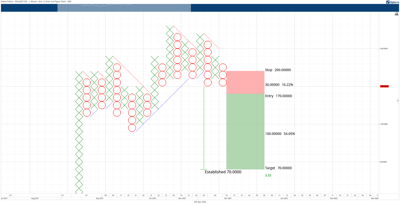 The short idea is invalidated if Solana price were to move to $230. In that scenario, a bullish continuation is likely to occur because Solana will have simultaneously moved above a critical high volume node and convert the $10/3-box reversal Point and Figure chart into a bull market.