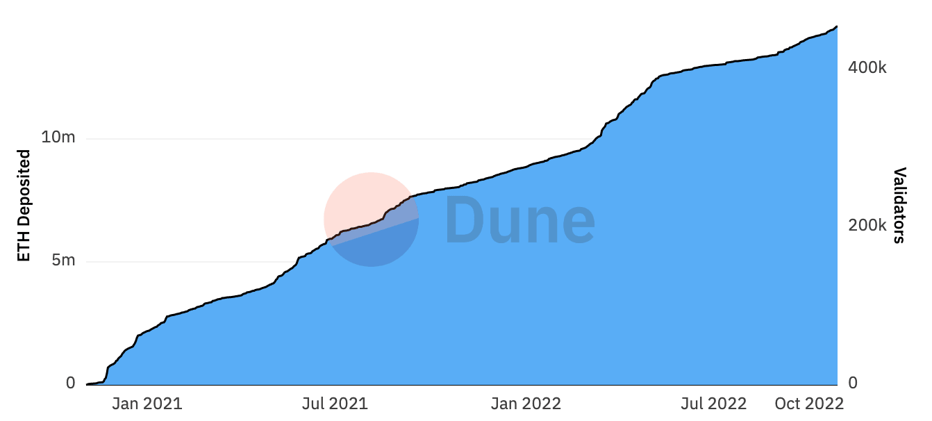 According to data from Dune Analytics, more than 14 million ether (ETH), worth over $2 billion, are currently being staked on the Ethereum blockchain, including a spike in deposits during the third quarter, when the shift to the proof-of-stake model took effect, known as the Merge. That amount of ether staked is up 7.5% from the end of the second quarter.