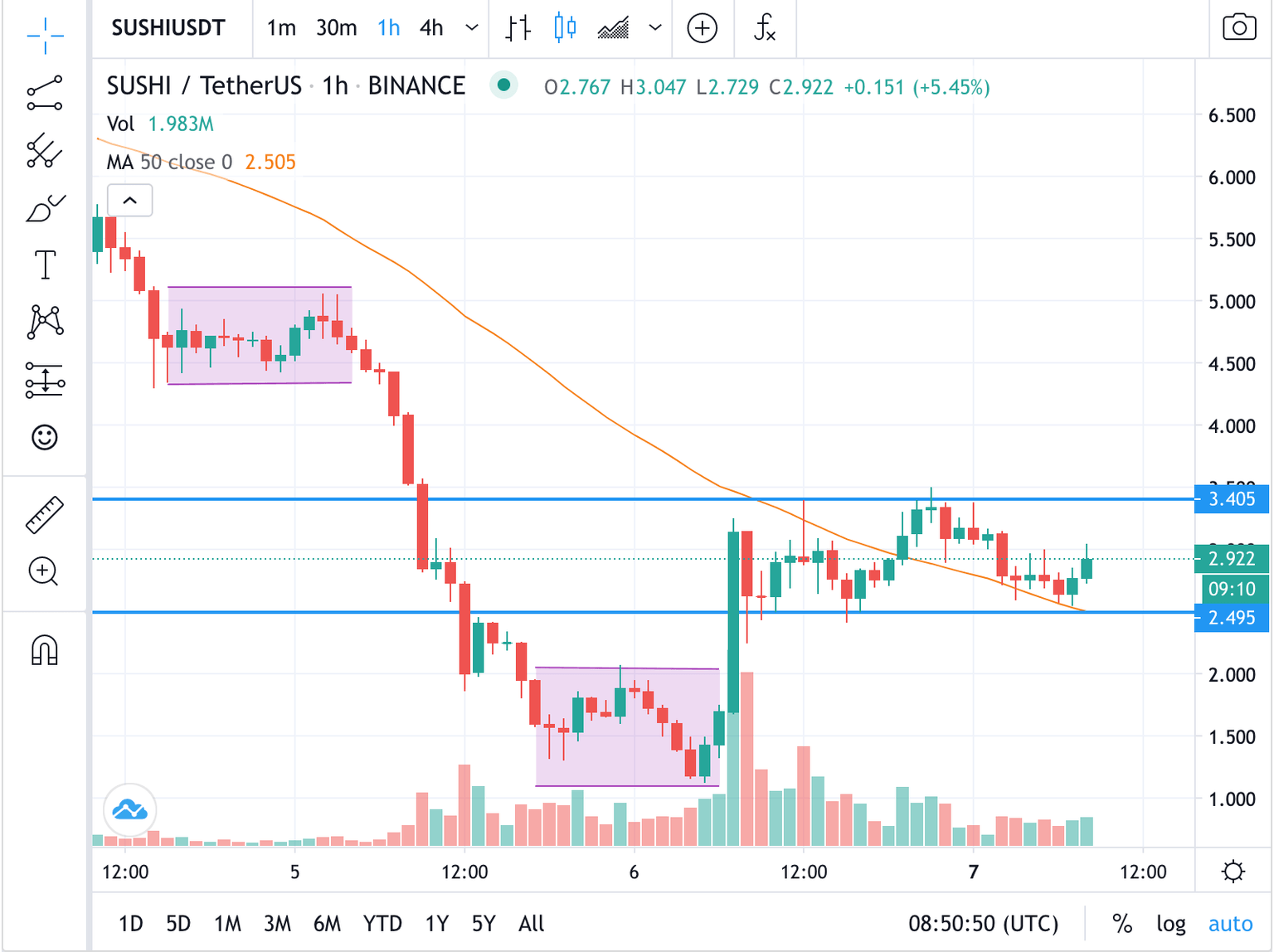 SUSHI token has been the talk of the crypto town these days. The asset price topped at $11.17 on September 1 and hit bottom at $1.20 on September 6. At the time of writing, SUSHI/USD is changing hands at $2.78, while its total market value is registered at $190 million and an average daily trading volume of nearly $1 billion. It is most actively traded on Uniswap and Binance. The project is ranked 63d in the CoinMarketCap's rating. SUSHI has gained over 17% in the last 24 hours and lost over 10% on a week-on-week basis.