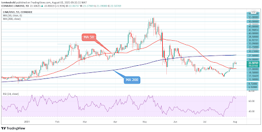 While the MA 50 could offer the main support at $18.71 to hold dips, if the bearish scenario unfolds, the LINK/USD pair may plunge to meet fresh demand at $13.45.