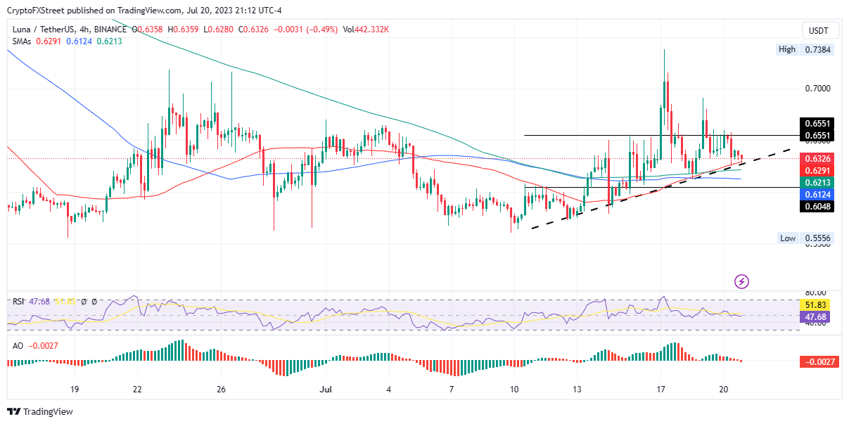 Terra Luna Classic (LUNC) price is testing the crucial support confluence offered by the ascending trendline and the 50-day Exponential Moving Average (EMA) at $0.629. This exposes LUNC to the risk of an extended slump if the support breaks.
