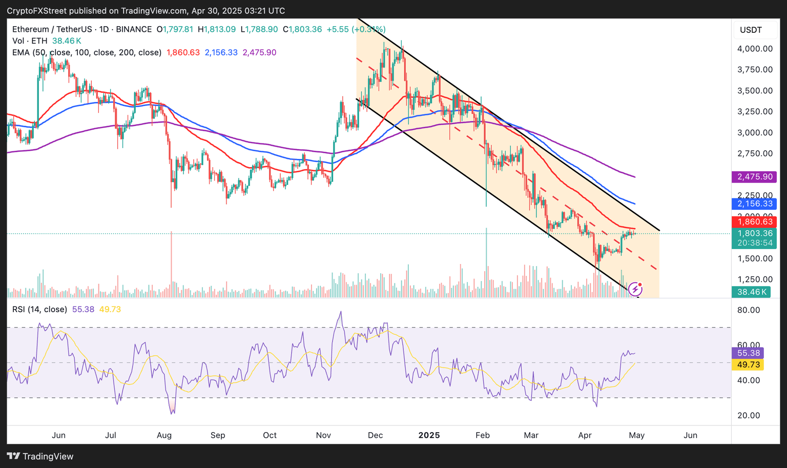 Ethereum’s price hovers at $1,800 at the time of writing on Wednesday, reflecting the ongoing consolidation in the wider crypto market. The largest smart contracts token faces resistance at $1,860, coinciding with the 50-day Exponential Moving Average (EMA). A breakout above this level is necessary to confirm the bullish potential and solidify the trend reversal from the descending channel on the daily chart below.