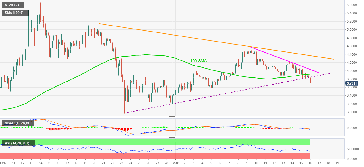 A clear break of an ascending trend line from February 23 favors XTZ/USD bears during early Tuesday. Not only the previous support break but bearish MACD and downward sloping RSI line also suggests further downside of the cryptocurrency pair, currently down over 3.0% near $3.71.