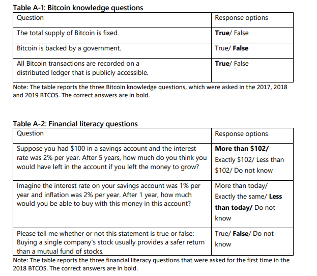 However the financial literacy testing was based on just three multiple choic questions that focused on interest rates, inflation and stock/mutual fund comprehension. The three Bitcoin questions focused on supply, the digital ledger and whether the network is backed by the government or not.
