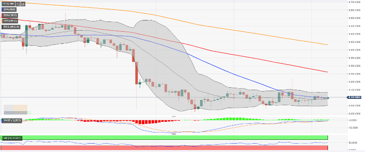 BTC/USD is hovering in the range limited by $8,150 on the upside and $8,000 on the downside. While the price managed to recover from the recent low of $7,990, the upside momentum is nowhere to be seen. Looking we will need to see a sustainable move above $8,150 barrier strengthened by the upper line of 1-hour Bollinger Band to mitigate the initial bearish pressure.