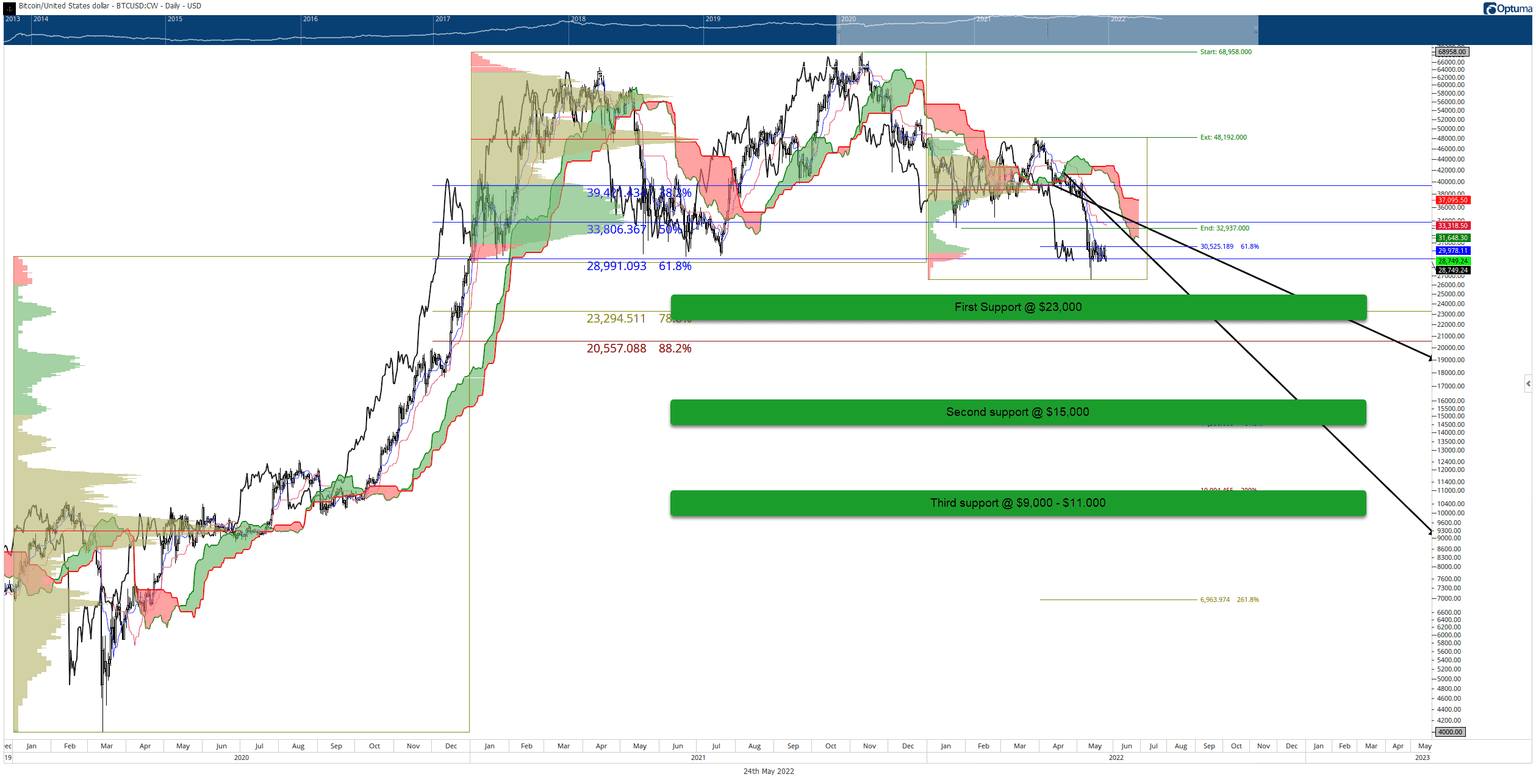 $15,000 – contains a high volume node in the 2020 Volume Profile at $15,300 and the 161.8% Fibonacci expansion at $14,500.