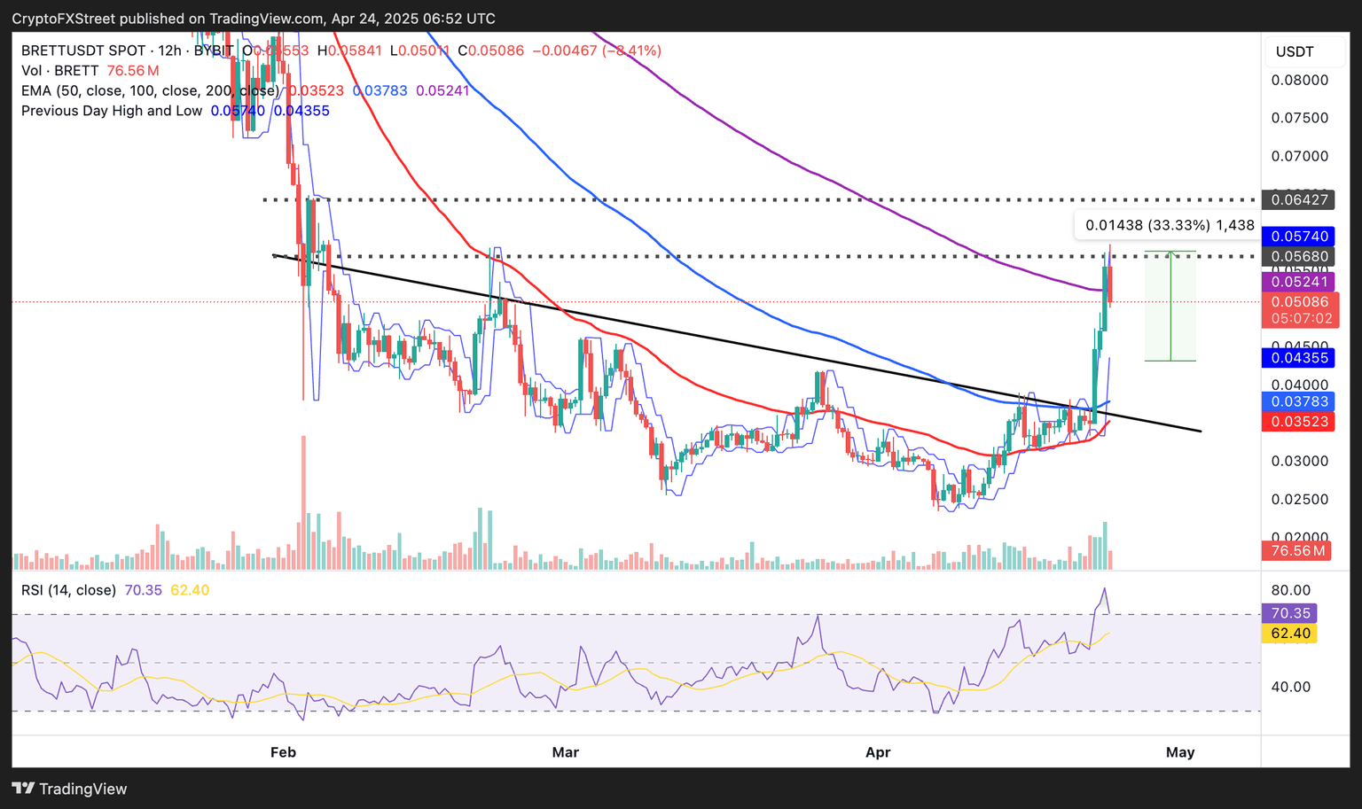 After lifting into overbought territory on Wednesday, the RSI at 70.16 hints at an extended retracement unless bulls push to reclaim position above the 12-hour 200 EMA at $0.0524. Such a move could sustain investor interest in Brett, paving the way for gains above $0.0642, a resistance last tested in February.