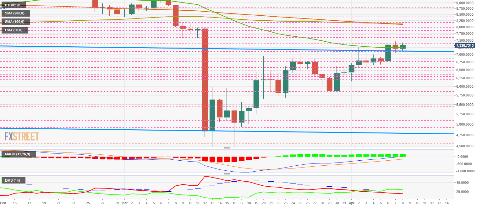 The BTC/USD pair is currently trading at the price level of $7330 and confirms support in the long-term downward sloping channel ceiling. The main moving averages show a mixed position, with the 50-day Exponential Average curving higher while the 100-day and 200-day Simple Averages holding the downward trend at around $8250.