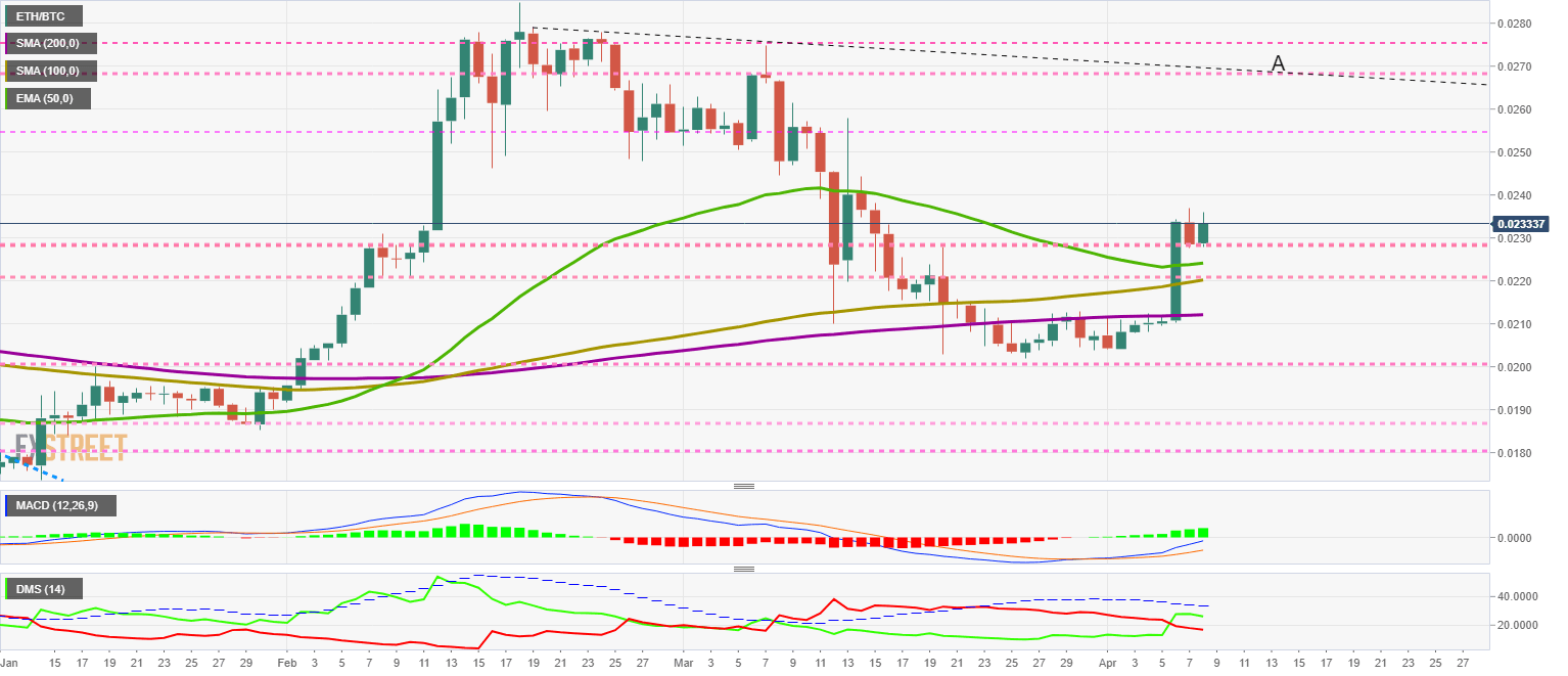 ETH/BTC is currently trading at the price level of 0.0233 after confirming congestion support at 0.0228.