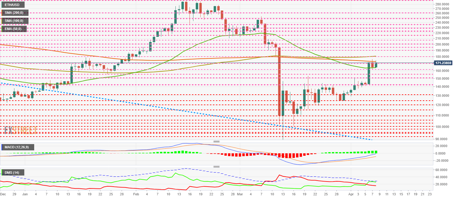 The main moving averages on the ETH/USD chart point slightly upwards, in contrast to the BTC/USD one.