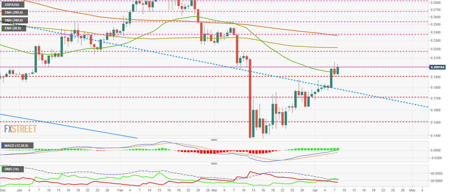 The XRP/USD pair is trading at $0.1999 and is struggling to conquer the resistance level at $0.20.