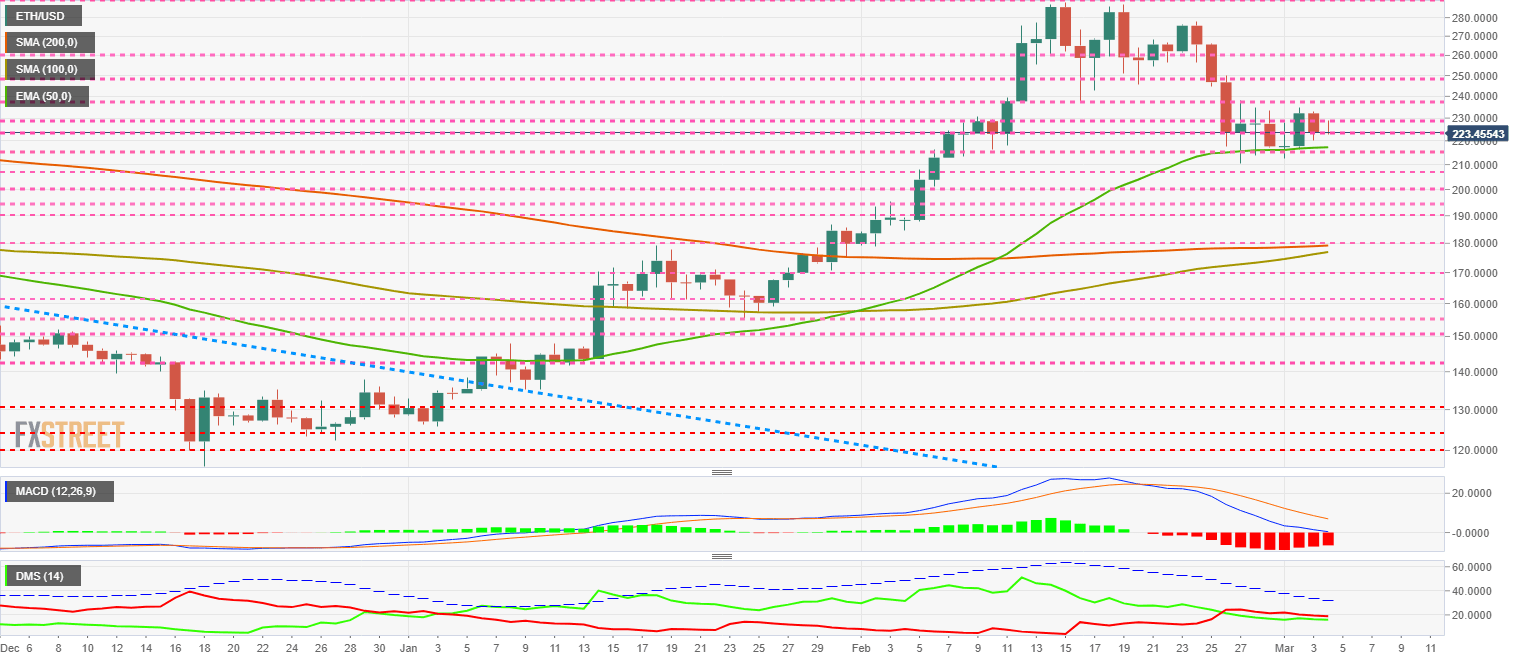 ETH/USD is currently trading at the price level of $223.4 and is playing dangerously close to a support level that would invalidate the bullish pattern activated on Monday at $223.5.