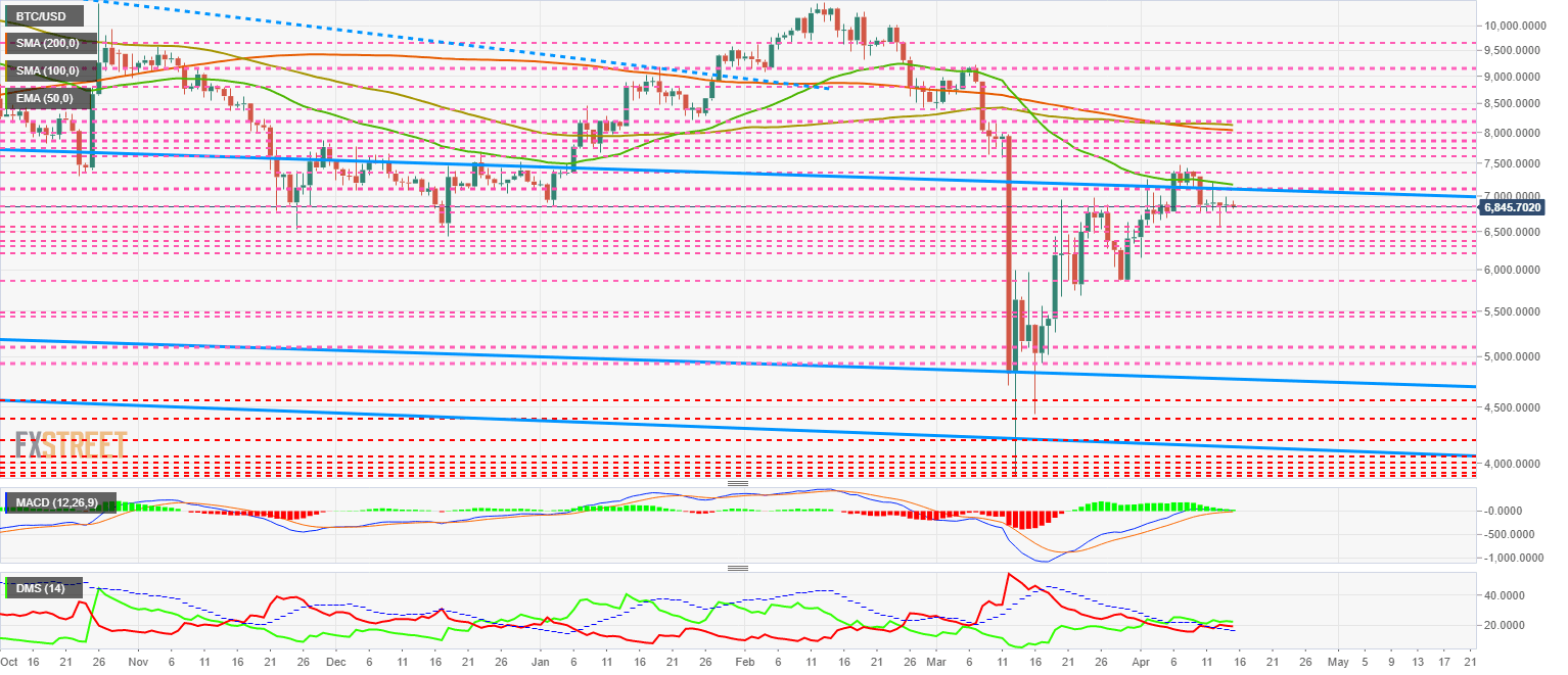 The BTC/USD pair is currently trading at the $6845 price level and is holding on to the last reliable support level before it can attack the long-term downward sloping channel ceiling.