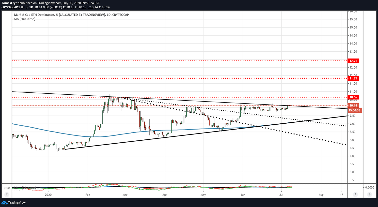 Ethereum managed to break the bearish trend on its dominance chart three days ago. Still, it is having a hard time breaking away from the resistance line – now support – and developing an uptrend in the new favorable scenario. The technical targets for market dominance for the Ethereum are 10.66%, 11.83% and 12.91%.