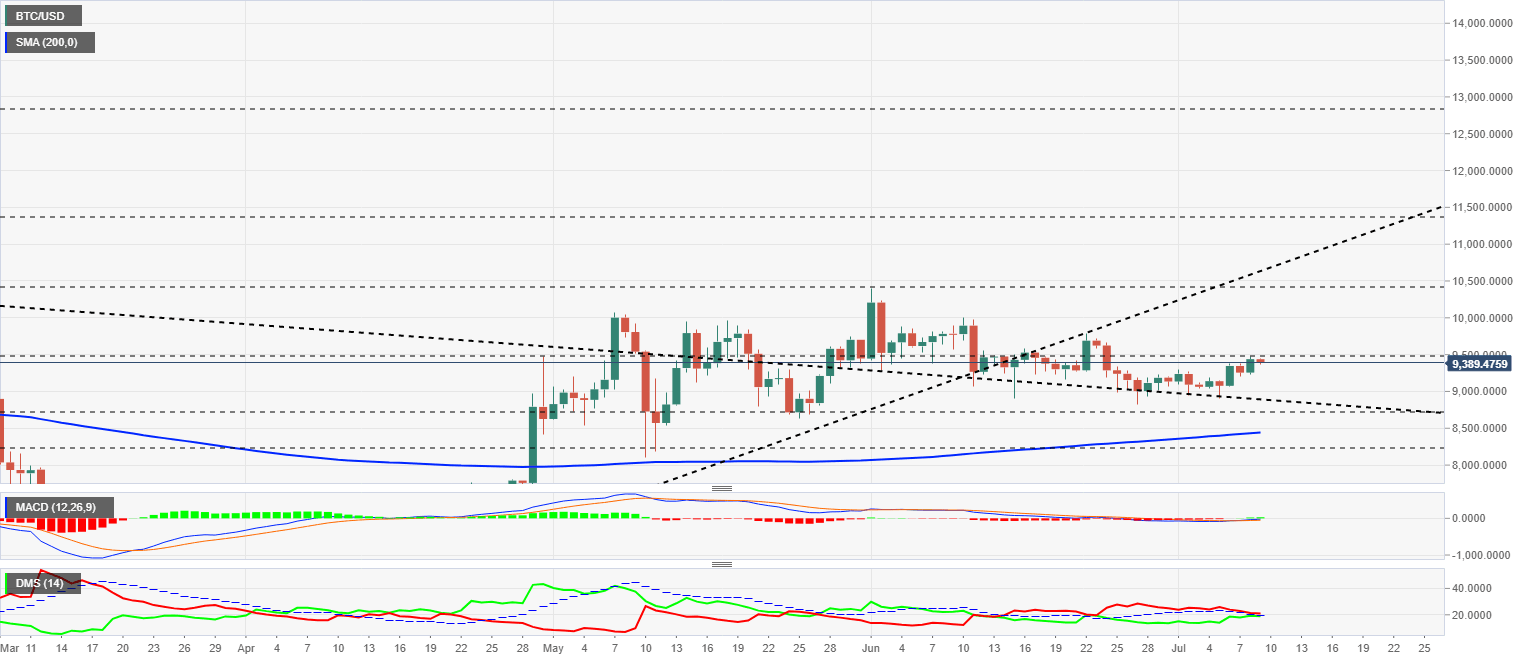 The BTC/USD pair is currently trading at the price level of $9389 and remains within a few points of the price congestion resistance at $9500.