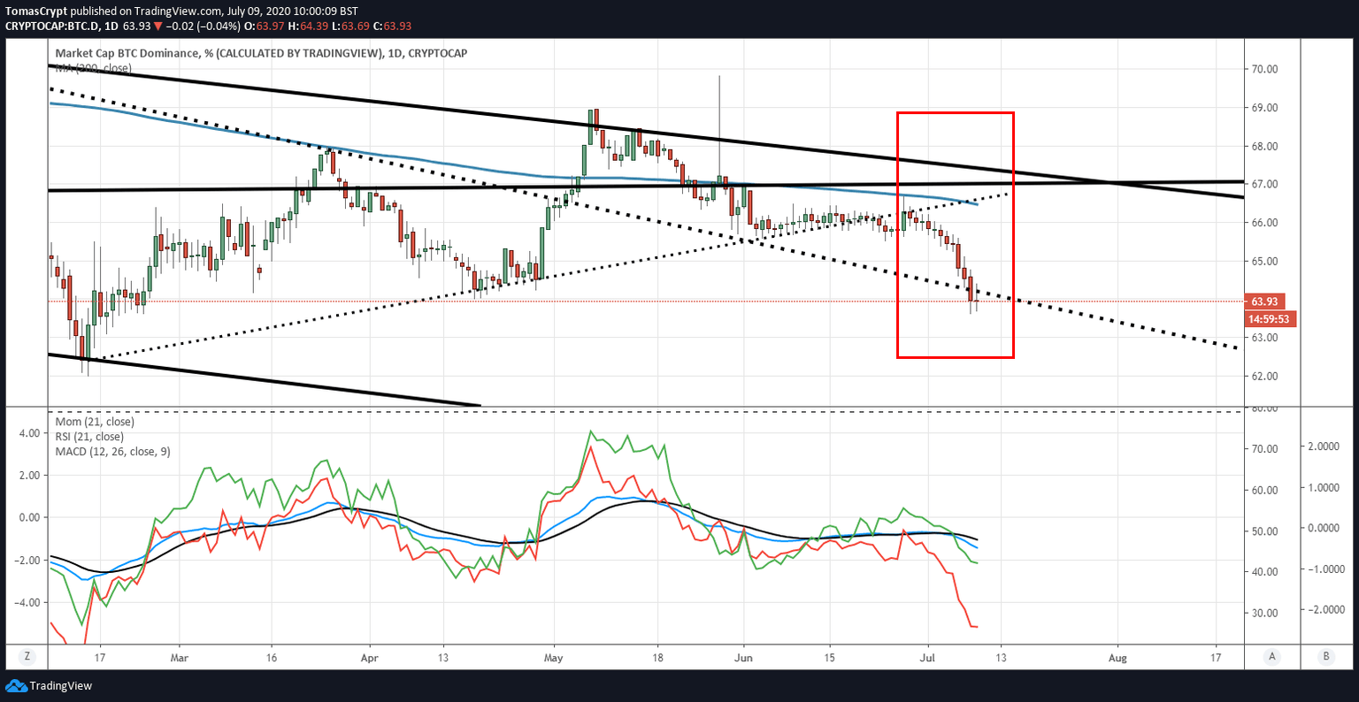 Yesterday Bitcoin lost 64% market share, a first support level within the bearish channel that governs Bitcoin's current market share balance. The bearish target is below the 60% level. The weakness of Bitcoin favors the Altcoin season that we see these days.