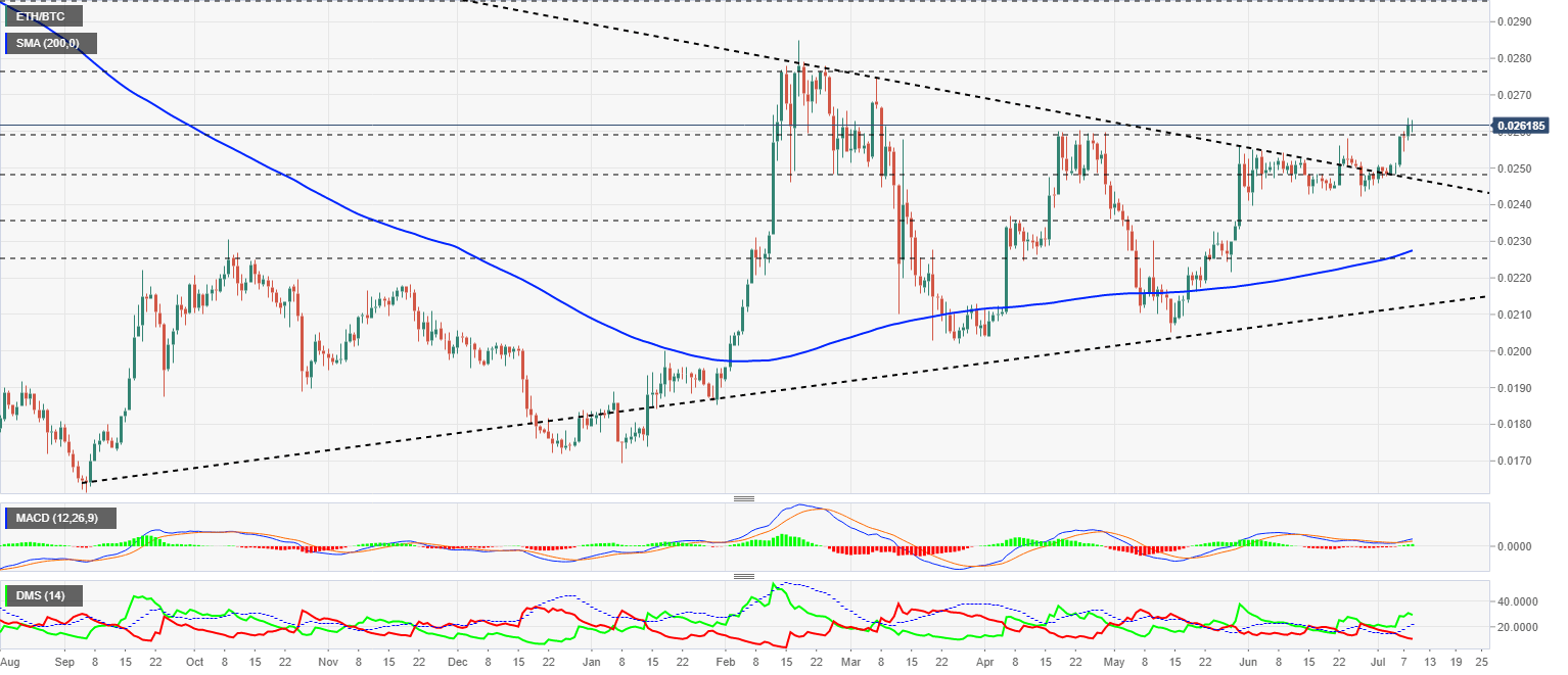 The ETH/BTC pair is currently trading at the price level of 0.02618, on its way to the next resistance level at 0.0278. The 200-day simple moving average increases the bullish profile and confirms the momentum change in the ETH/BTC pair.
