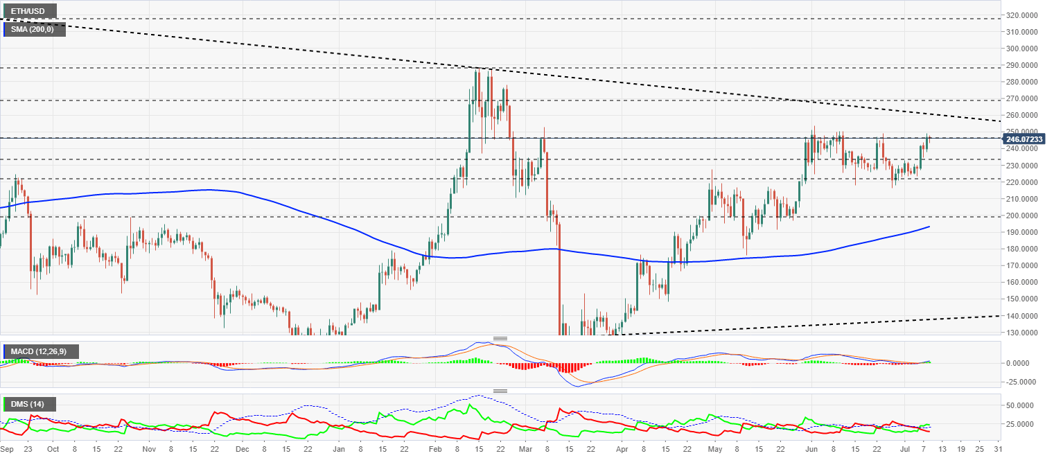 The ETH/USD pair is currently trading at the $246 price level and is having a hard time breaking out of the $247 resistance level. The 200-day simple moving average is accelerating upward, providing support for the uptrend in the medium term.