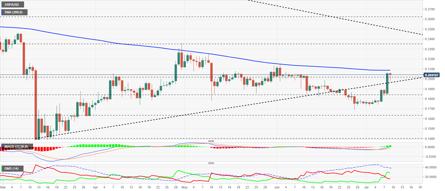 The XRP/USD pair is currently trading at $0.2041 after yesterday's significant rise. XRP/USD has managed to escape from the dangerous downtrend it has been in for the past few weeks. The 200-day simple moving average passes through the $0.21 level, making that level key to price development in the short term.