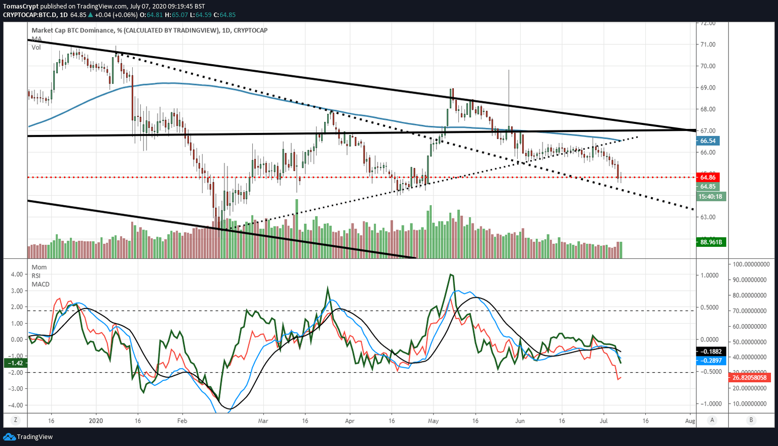 Despite Bitcoin's attempt to regain market share, technical indicators do not show a pattern of change in direction, which bodes well for further losses of dominance by Bitcoin. The next support level is at 64%, and from there it will move to the 62.5% level.
