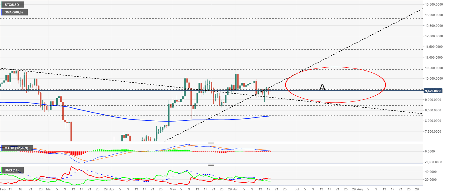 The BTC/USD pair is currently trading at the price level of $9430 while moving a little further into the expanding triangle scenario (A).