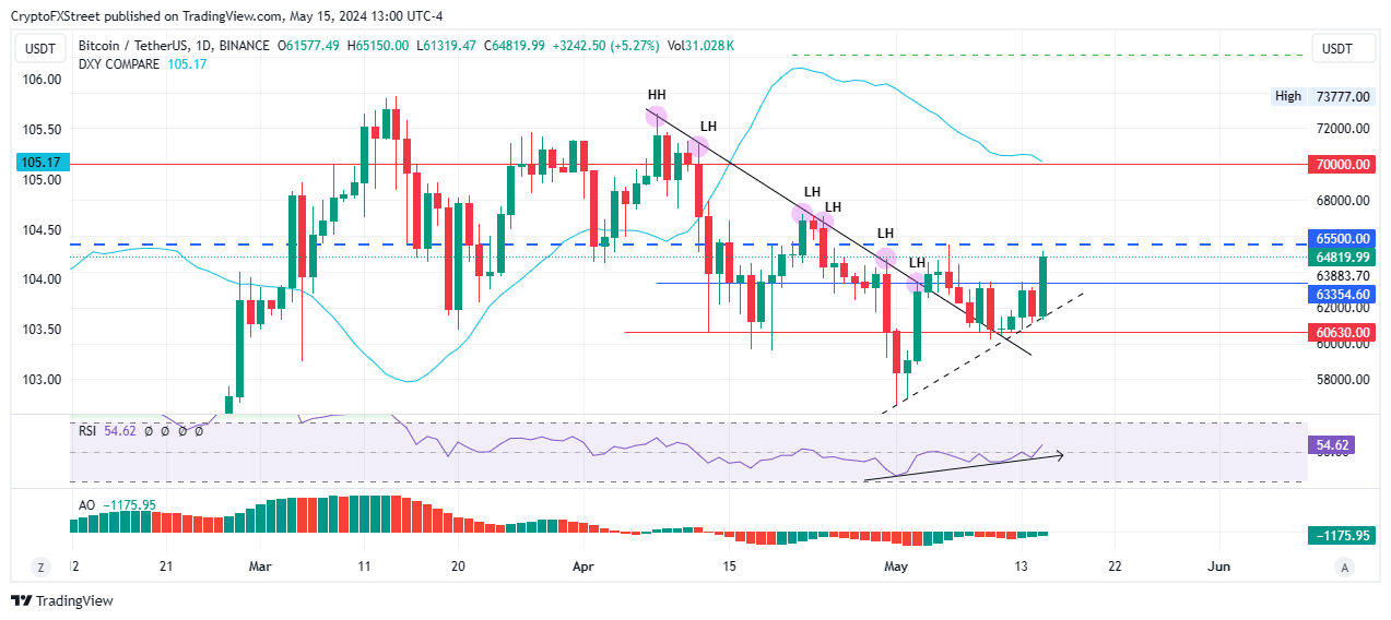 A stable close above $65,500 on the one-day time frame would encourage more buy orders, with the ensuing buying pressure sending Bitcoin price to $70,000. Beyond this level, BTC would have a chance at taking back the $73,777 peak. Notably, the DXY Compare indicator is also dropping, which has often displayed a countercurrent flow against BTC price.