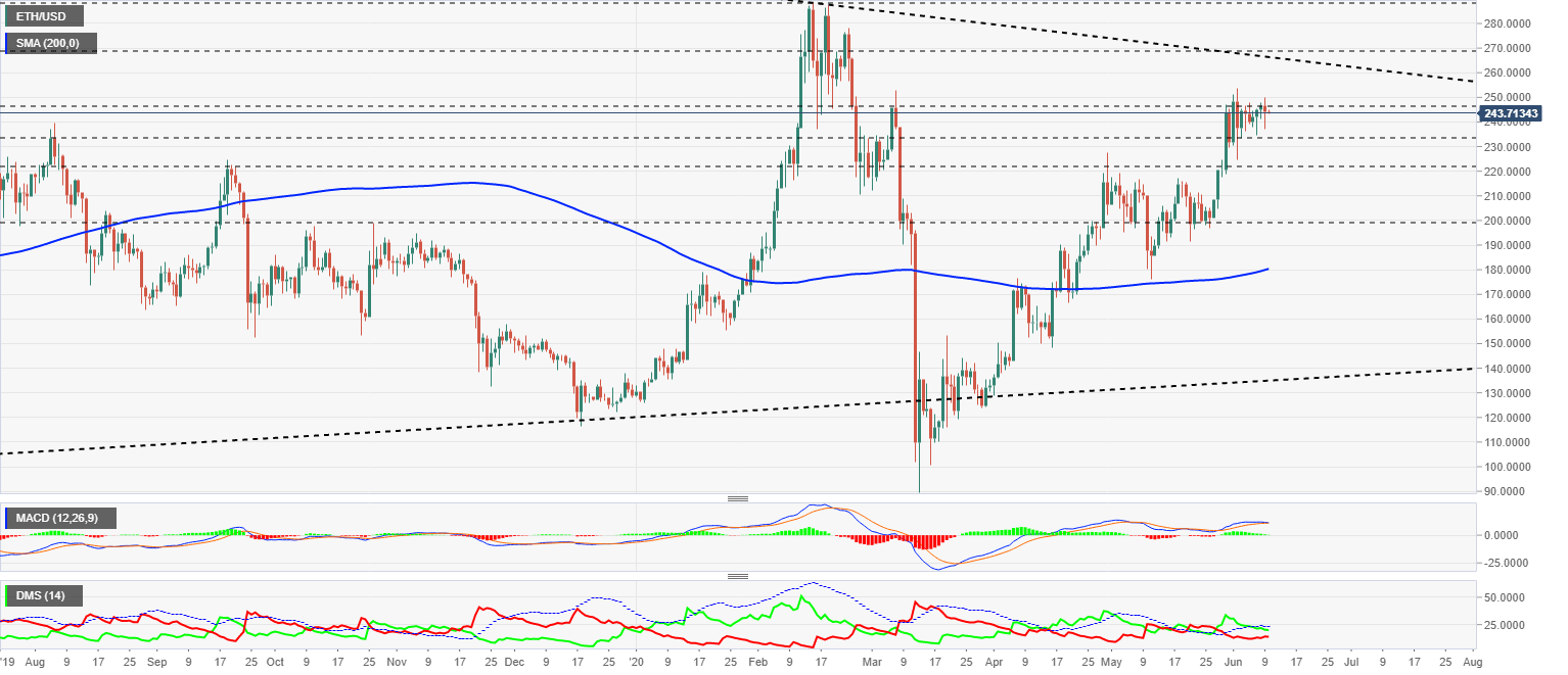 The ETH/USD pair is currently trading at the price level of $243.7 and continues to consolidate below the critical level of $250. A consolidation below a significant resistance level is always bad news.