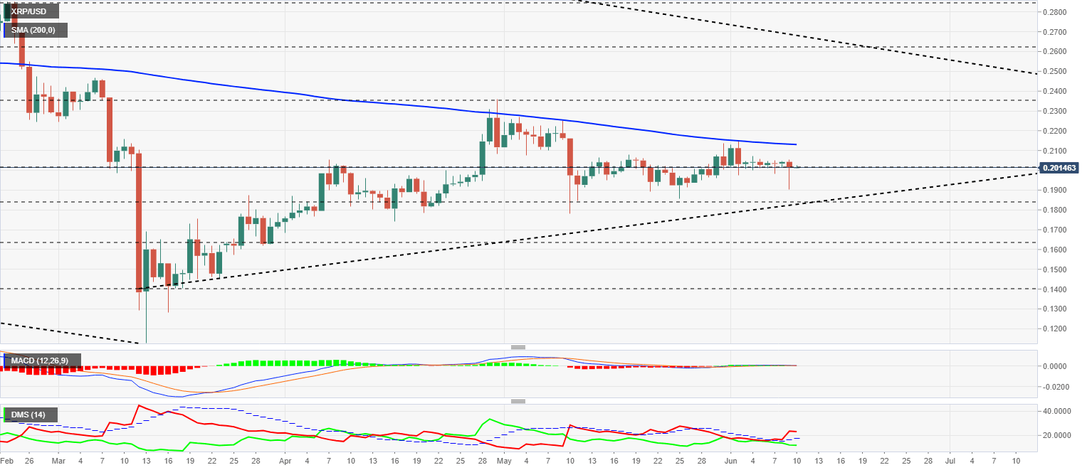 The XRP/USD pair is currently trading at $0.2014 after barely moving a few cents today. The Ripple price is being compressed by the presence of the 200-day simple moving average at $0.21, above, and the rising trend line from the March lows at $0.185, below.