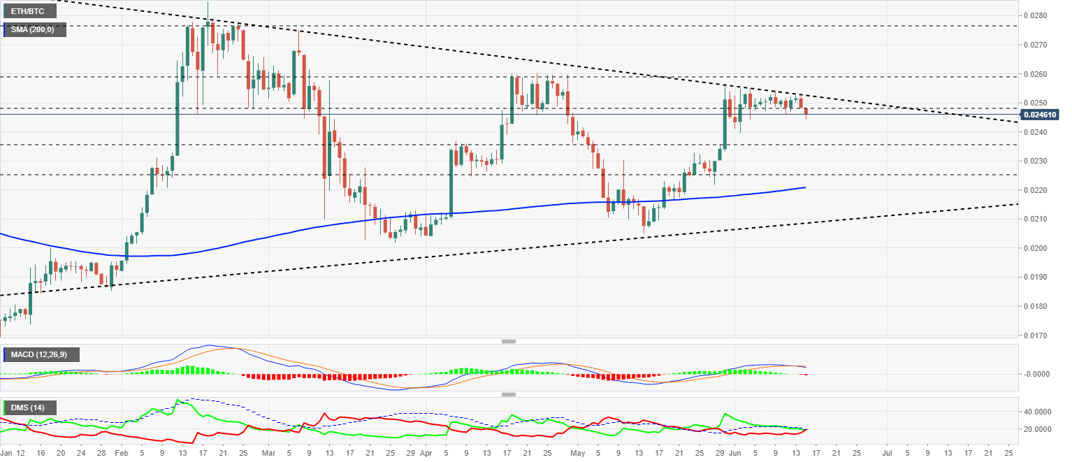 The ETH/BTC pair is currently trading at the price level of 0.0246, clearly breaking through price congestion support at 0.0248 and heading to the next support level at 0.0235.