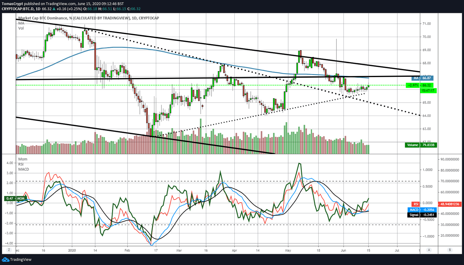 The MACD on the daily chart shows a complete but still very recent bearish cross. The ETH/BTC pair is entering a bearish trend at the moment.