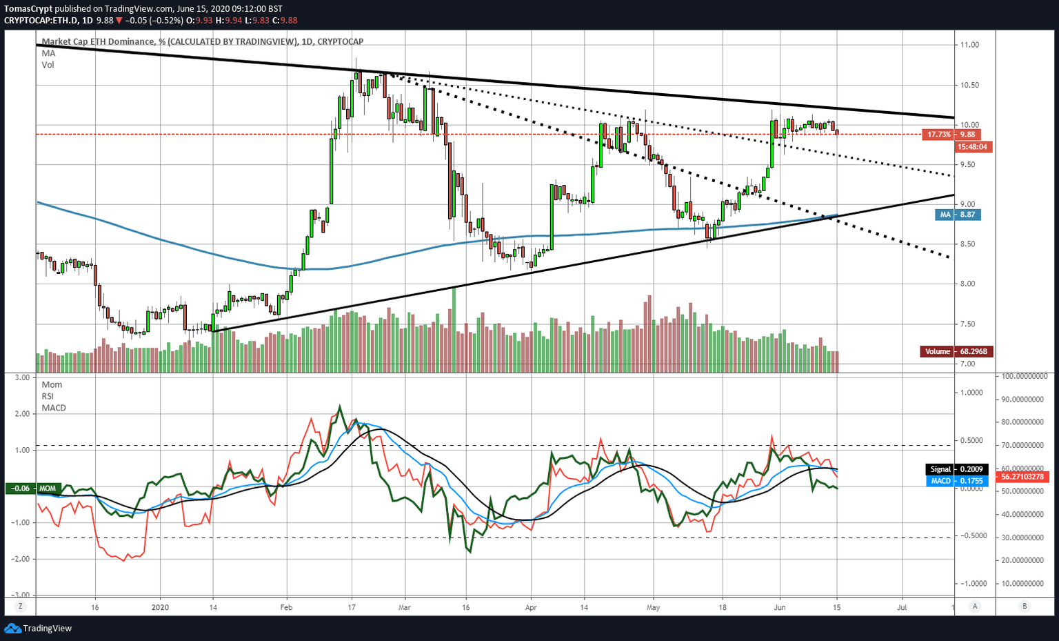 Ethereum is driven down by the momentum of King Bitcoin and has lost the support of the 10% market share level. The first support level is at 9.65% below which the fall would accelerate looking for support in the 8.87% area.