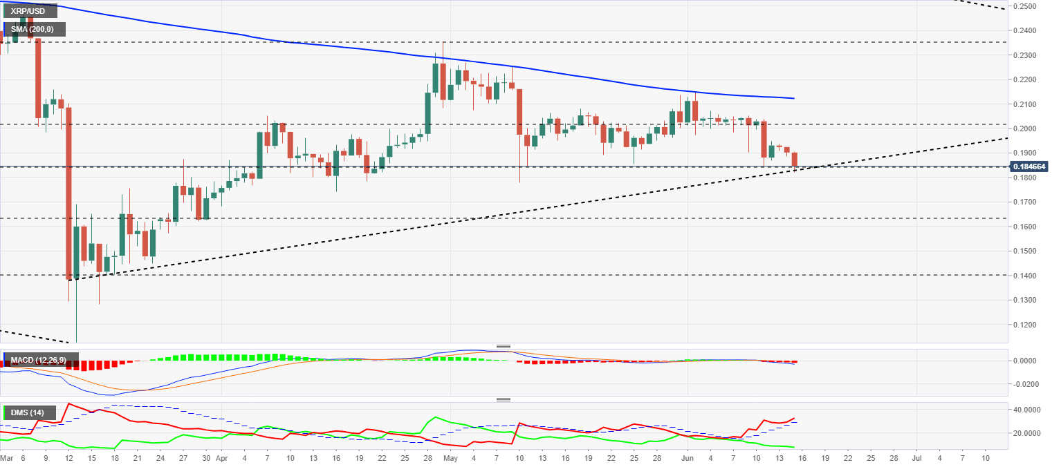 The XRP/USD pair is currently trading at the price level of $0.184 while playing dangerously close to the lower trend line that emerges from the March lows.