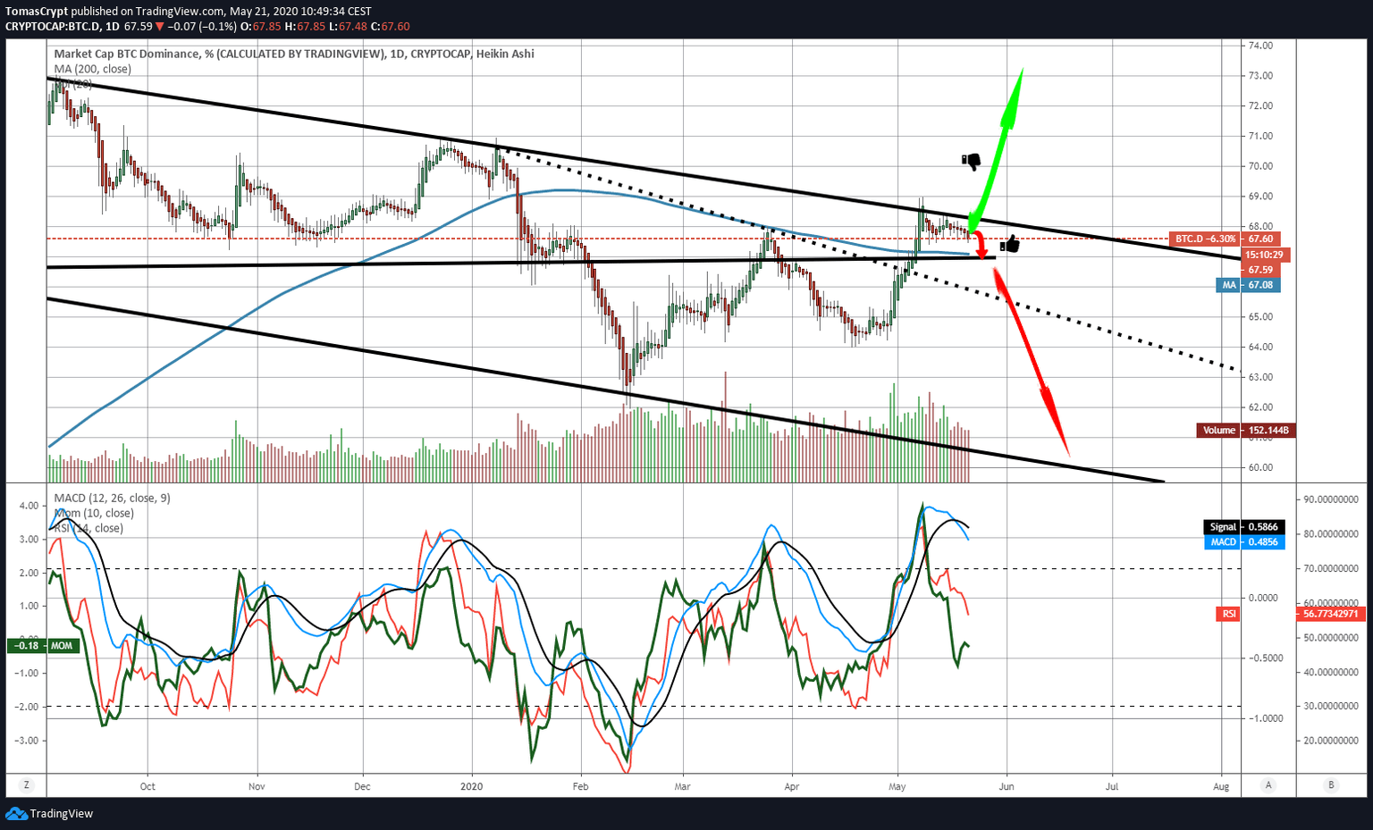 After the last attempt to break through the long-term bearish channel, Bitcoin dominance level is now looking for support at the 67 levels, where a price congestion support level and the 200-day simple moving average converge.