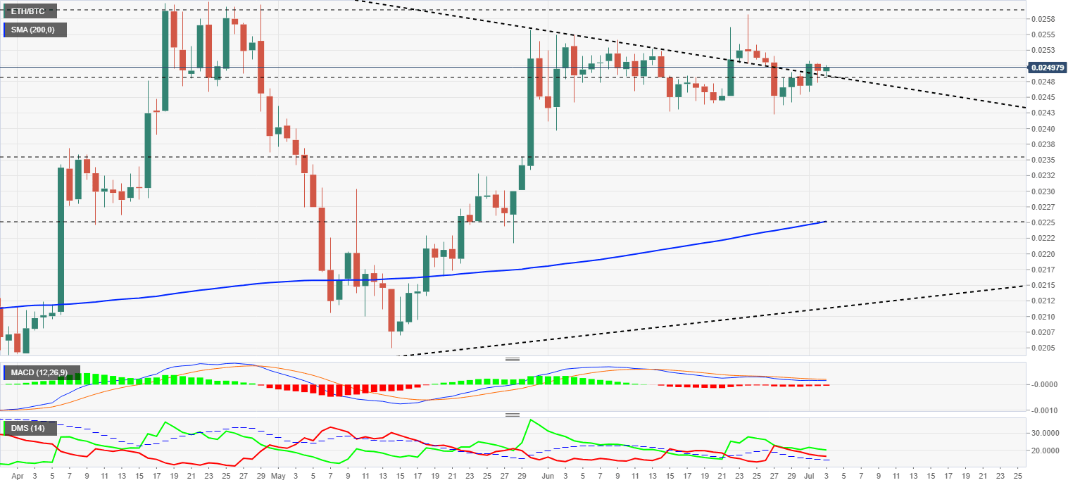 The DMI on the daily chart shows bulls dominating the pair despite the loss of strength over the past few days. The bears are moving above the ADX line, which prevents declaring a full-bullish situation for the ETH/BTC pair.