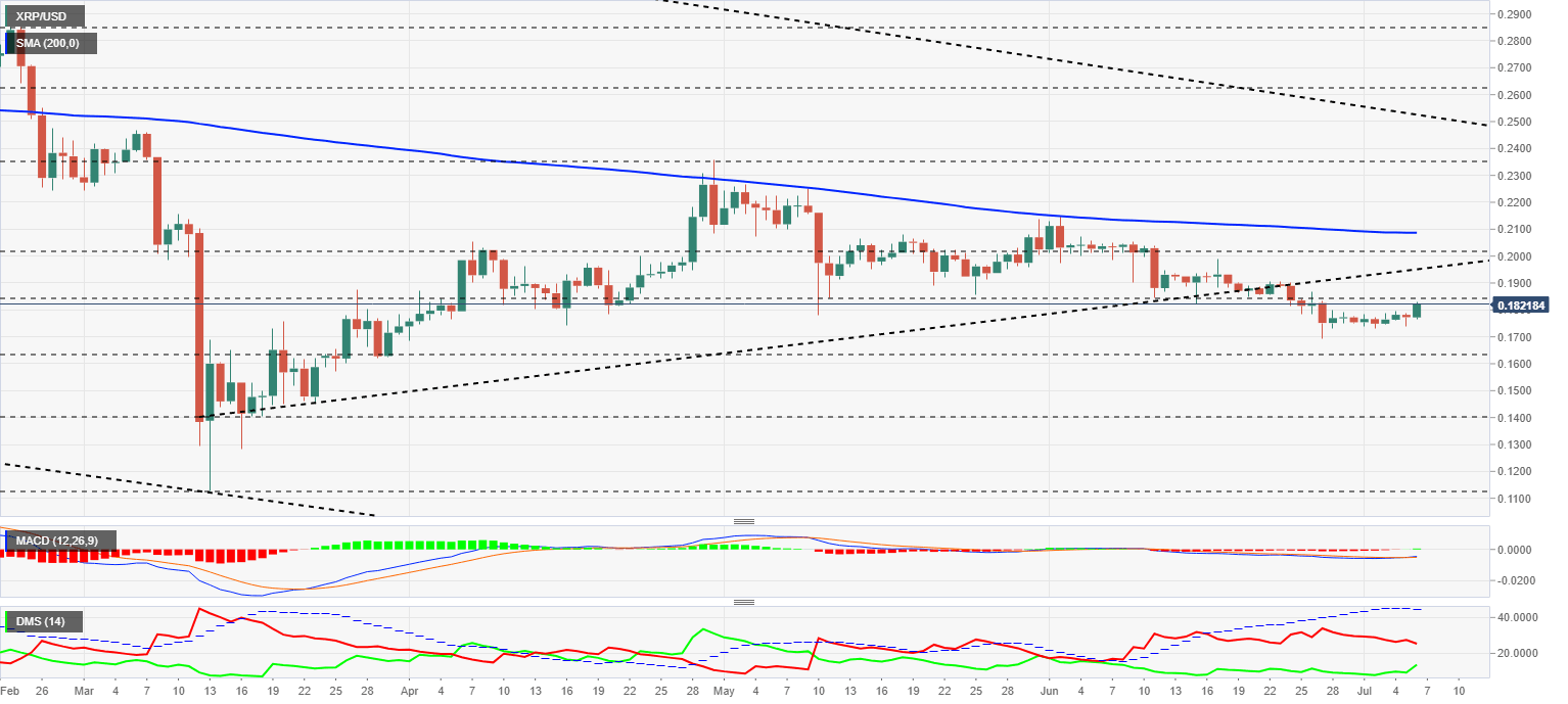 The XRP/USD pair trades at $0.182 and seems to come back to life after a couple of weeks in the underworld. Today's uptrend has left it at the gates of resistance due to price congestion at $0.19. The 200-day simple moving average is walking around the $0.21 level and exerts a significant pull on the price.
