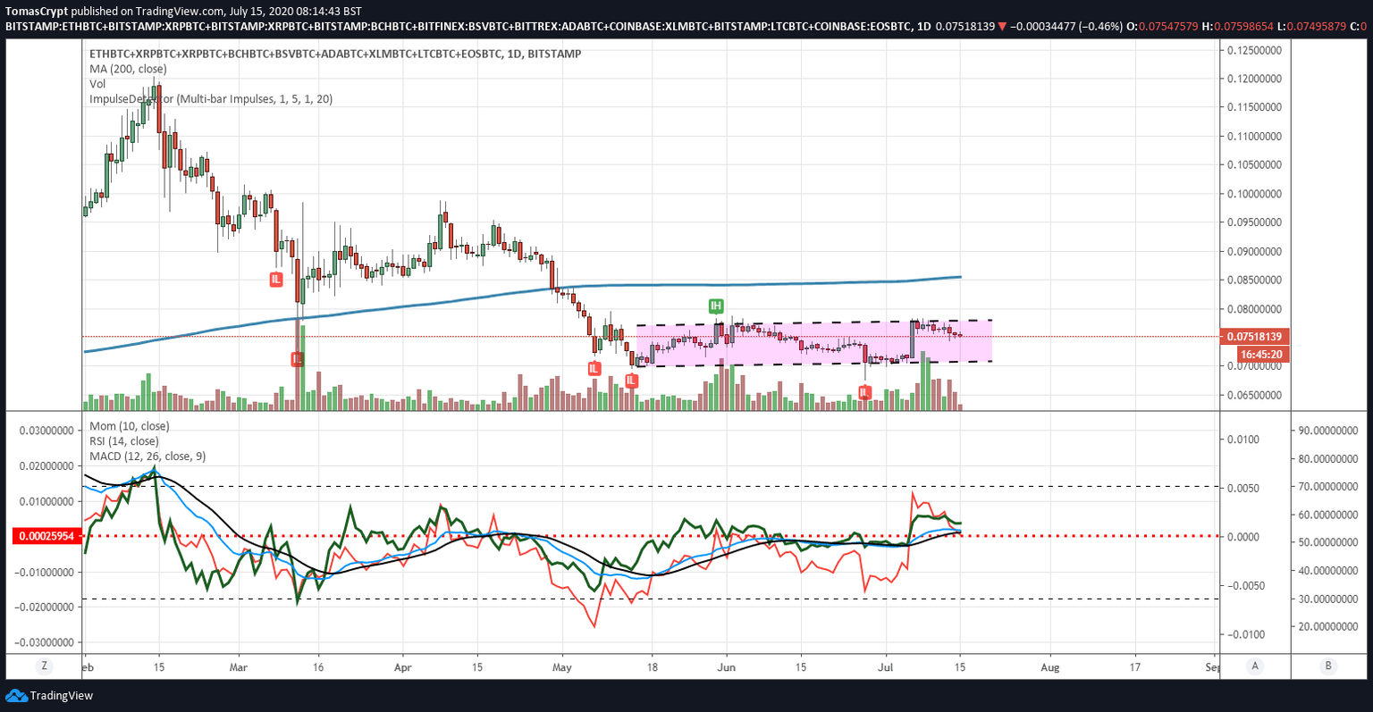 The ETH/BTC pair is currently trading at the price level of 0.0259, the same position as in recent weeks. The persistence in this price level allows the 200-day simple moving average to increase the bullish profile and rise rapidly.