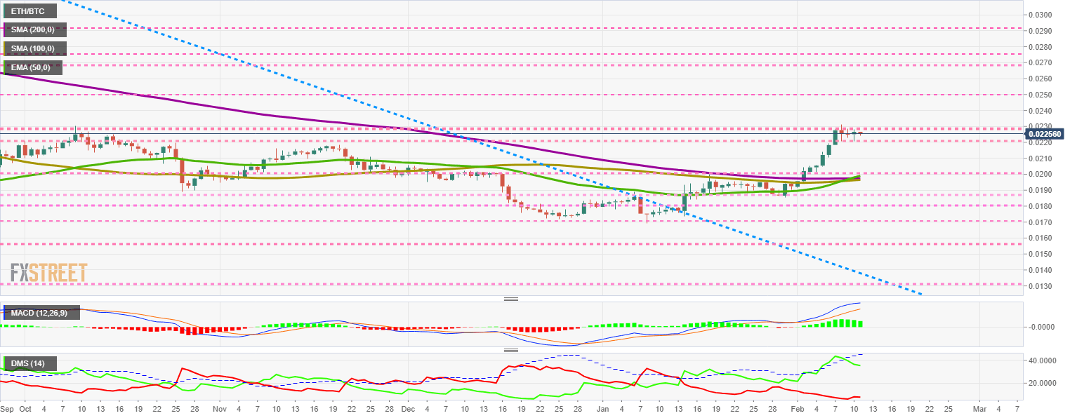 The ETH/BTC pair is currently trading at the price level of 0.02256, moving in a very narrow range between resistances and supports. The upward movement of the ETH/BTC is proving to be a real picture of the overall market, faithfully signalling the upside and downside stretches.
