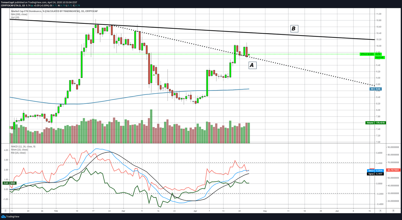 After yesterday's bullish attack, today it is Ethereum that is showing the desire to continue to struggle to increase its percentage of dominance in the crypto market. The strong reaction of the Bitcoin led the Ether's dominance chart to the support marked by the bearish trend line (A) beaten at the beginning of the week. The goal remains to break the May trend line (B) and it should not take long.