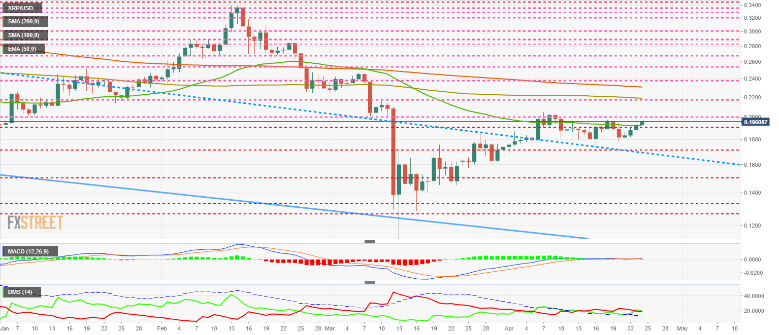 The XRP/USD pair is trading at $0.196 and today may repeat yesterday's attempt to break the $0.20 resistance level. XRP is lagging behind the Bitcoin and Ethereum in recent gains.