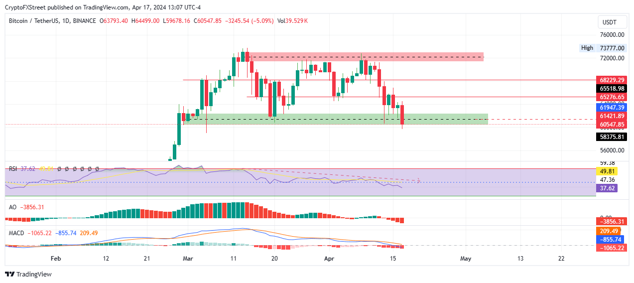 Bitcoin price has dipped into the demand zone between $60,364 and $62,412 for the umpteenth time since February. This time, however, it has slipped below its mean threshold at $61,421. Traders should watch the aforementioned level, because a candlestick close below it would confirm the continuation of the downtrend.