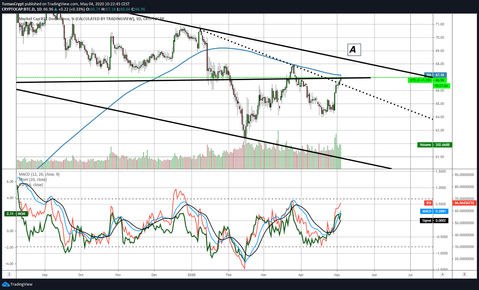 The Bitcoin now has a 67.16 level of market dominance, and if it manages to overcome the current obstacle, the primary target will be the 68.3 level, right at the top of the long term bearish channel (A).