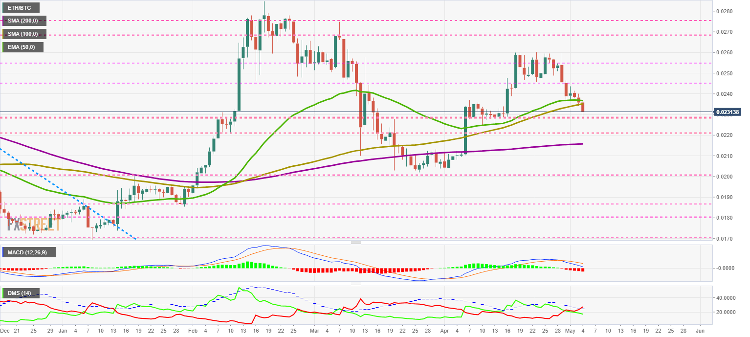 The ETH/BTC pair is currently trading at the price level of 0.0231, losing support at the 50-day exponential moving average and the 200-day simple moving average. The daily low is at the critical support level at 0.0227. Below this level, the technical structure would worsen for the Ether's interests against Bitcoin.