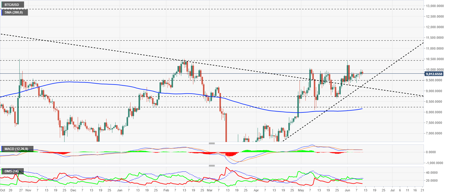 The BTC/USD pair is currently trading at $9820 and is pointing towards the $9450 levels for support. The current structure suggests that if sales finally do appear, the process will be short-lived.