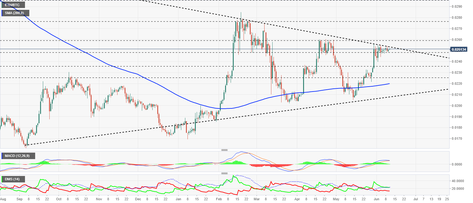 The ETH/BTC pair is currently trading at the price level of 0.02513. The downward resistance is at 0.0254 but needs a breakout of 0.026 at the daily bar close to confirm the breakout.