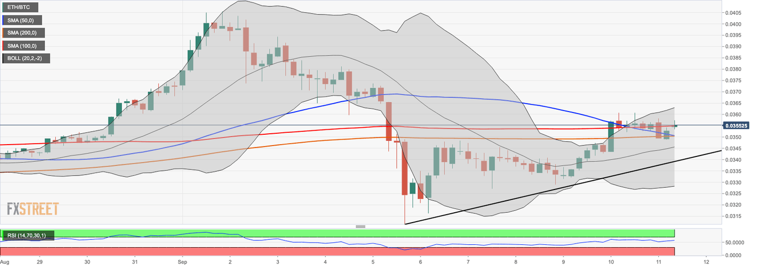 Meanwhile, a closer look at Bitcoin's interrelationship with Ethereum implies that ETH has room for growth. The cross has recovered from the previous week's low of $0,0311 and reached $0.0354 by the time of writing. The price settled above the daily SMA50 ($0.034) that coincides with the upside-looking trendline. This barrier serves as a strong backstop for ETH/BTC and supports the recovery towards $0.039 (the upper line of the 1-hour Bollinger Band) and the recent high of $0.0405.
