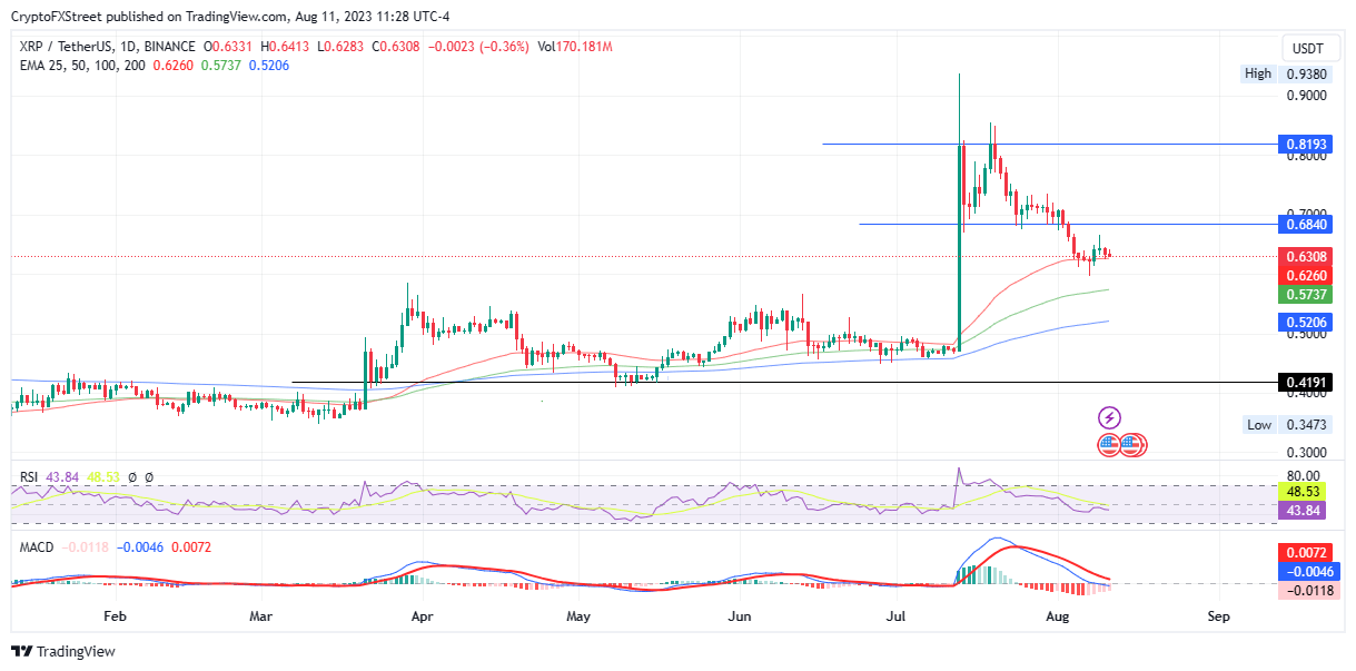 Ripple (XRP) price has been sitting on the 50-day EMA at $0.6308 for seven consecutive days, a risky stunt considering markets tend not to wait for so long. With broader crypto market momentum fading, chances of a slump increase, which could see the remittance token drop to the 100-day EMA at $0.5737. In a highly bearish case, the altcoin could slump further to test the $0.5206 support level.